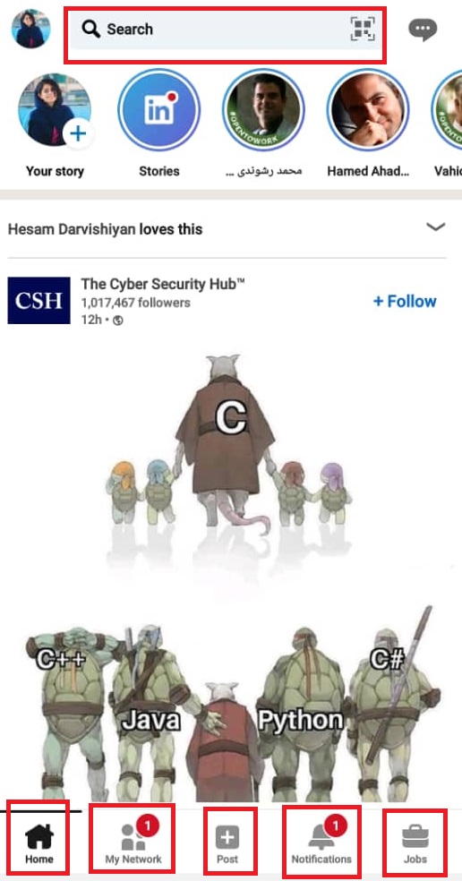 Home: این قسمت درواقع فید شماست. در این صفحه پستهای افرادی که با آنها کانکشن برقرار کردهاید به شما نمایش داده میشود. همچنین ممکن است صفحاتی را با توجه به علاقهمندیهای شما برای دنبال کردن به شما معرفی کند.